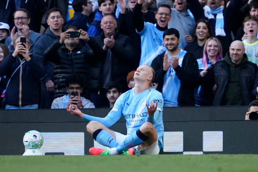 哈兰德打入反超比分的进球后做出标志性庆祝动作