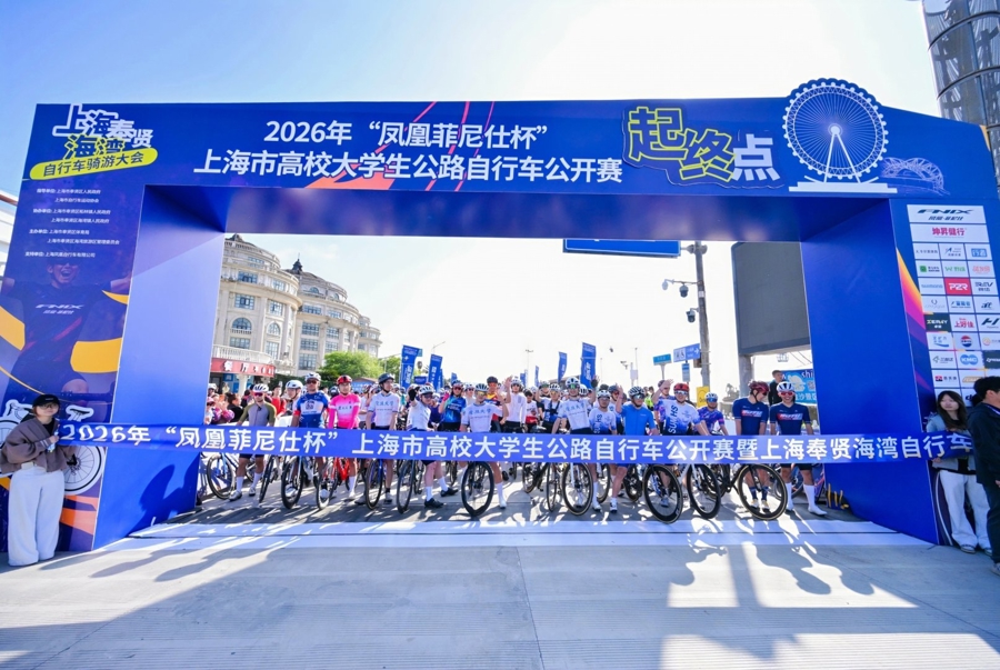 4月19日,2026年“凤凰菲尼仕杯”上海市高校大学生公路自行车公开赛暨上海奉贤海湾自行车骑游大会鸣枪开赛。包括29支高校车队选手在内的约2100名选手从渔人码头出发,踏上全长55公里的“南上海最美赛道”,在森林与海浪之间展开一场速度与风景的对话。